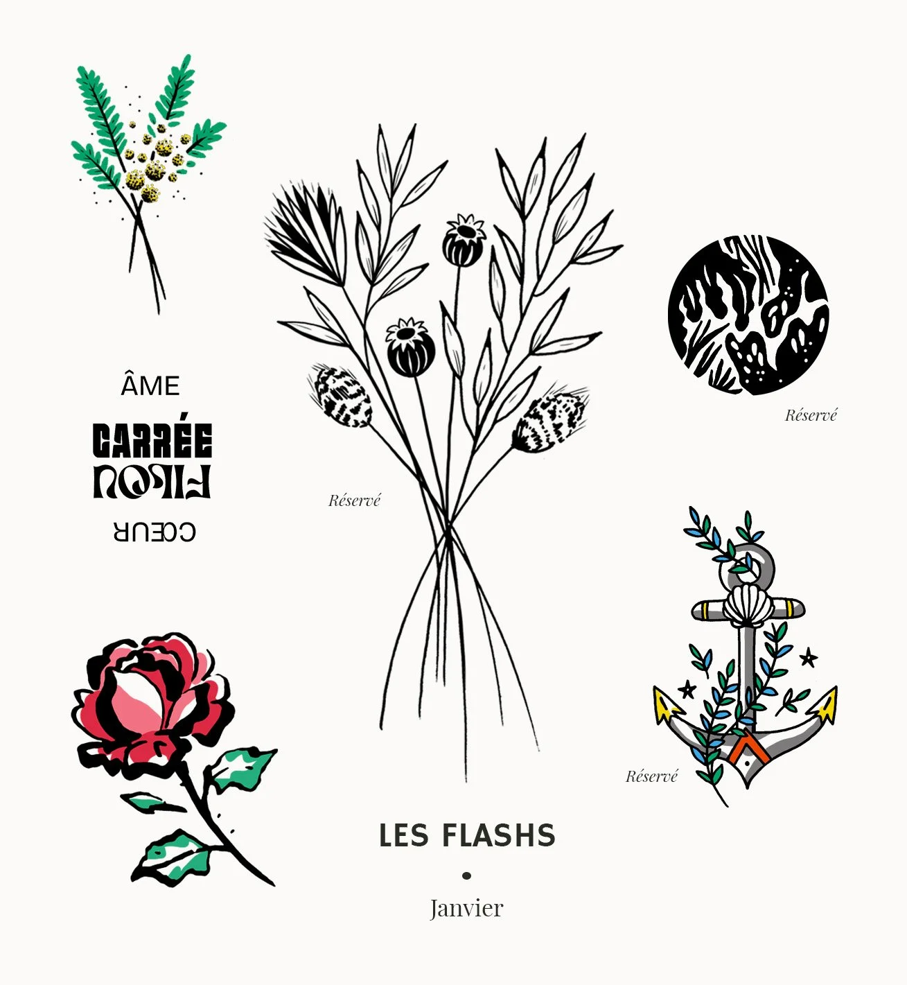 Je propose une fois tous les deux mois des flashs, des dessins prêts à être tatoués. Ils peuvent être tatoués tels quels, ou servir de point de départ à un projet plus personnel.